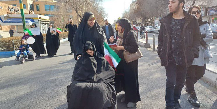 کمی جلوتر می روم خانمی را می بینم که روی ویلچر نشسته و به کمک دخترش در راهپیمایی شرکت کرده. سلام مادرجان با این وضعیت جسمی چرا به راهپیمایی آمده ای؟ آمده ام تا بگویم ما همیشه پشتیبان انقلاب هستیم. آمده ایم تا روح شهیدان از ما راضی باشد. آمده ام تا بگویم ما پیروزیم.