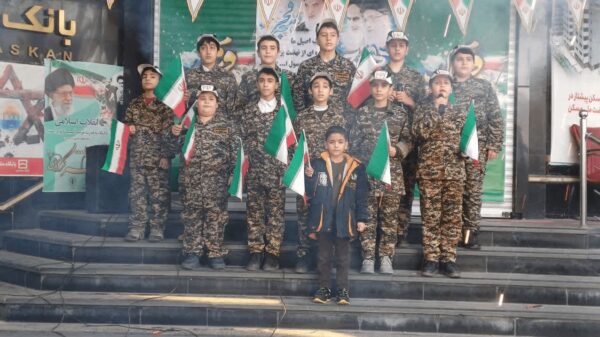 در مسیر دیگری از راهپیمایی جشن تولد انقلاب گروه سرود صبح وصال با یونیفرم یک دست شامل دانش آموزان دبستان و راهنمایی سرودهایی با مفاهیم انقلاب در رثای ایران می خوانند.